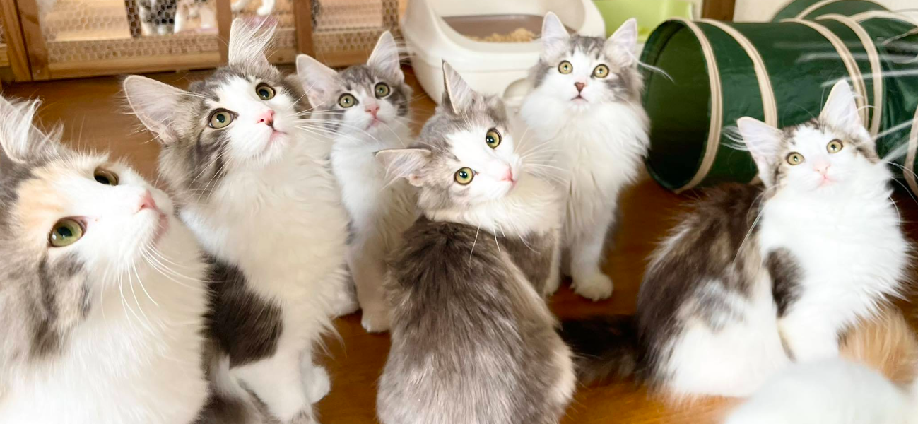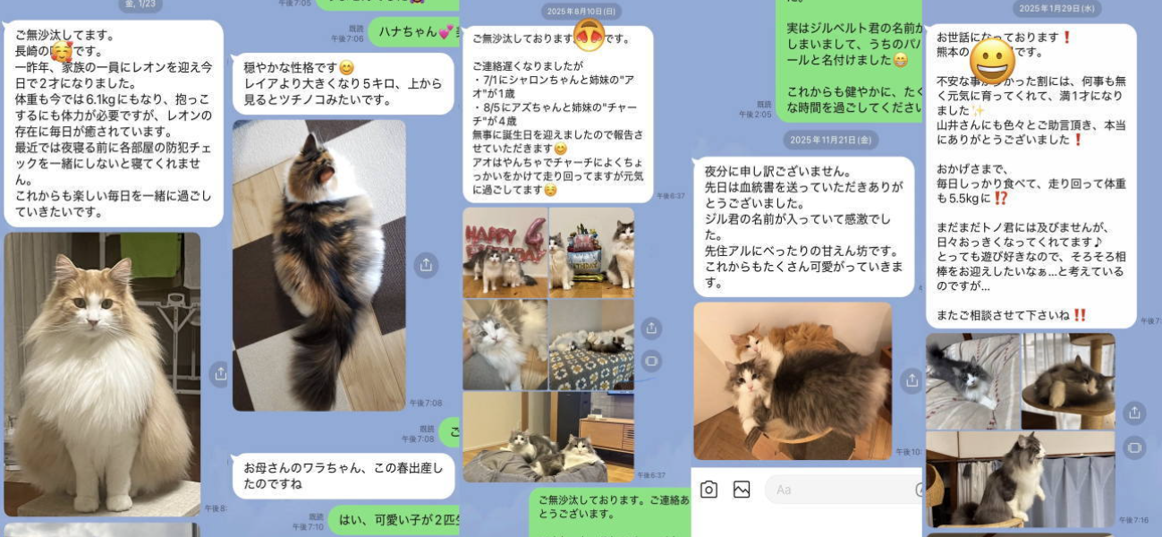 子猫をお迎えいただいて終わりではなく、そこから始まるご家族との暮らしこそが、私たちにとって何より大切な時間です。このページでは、ノルウェージャンフォレストキャットをお迎えくださったご家族からLINEでお送りいただいた、成長の様子や日常のひとコマをご紹介しています。それぞれのご家庭でのびのびと暮らし、少しずつ“家族の一員”になっていく姿からノルという猫の魅力と、その後の幸せを感じていただければ幸いです。