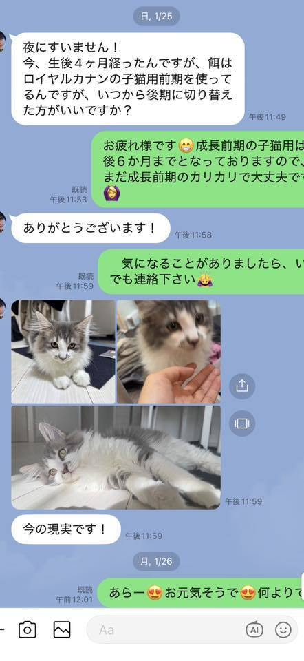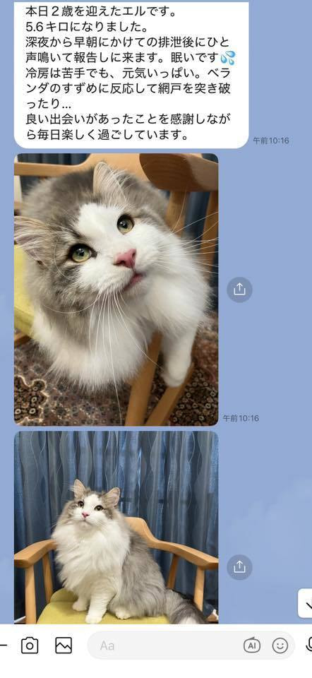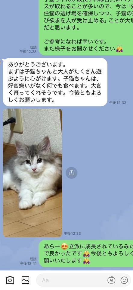 ブリーダーの仕事は、子猫をお渡しした瞬間で終わりではありません。本当の仕事は。その子が幸せな一生を送っているかどうか。こうして成長した姿をみせていただくたびに「間違っていなかった」そう思わせてもらっています。写真を送ってくださる皆さまへ。私たちは、いつも胸がいっぱいです。